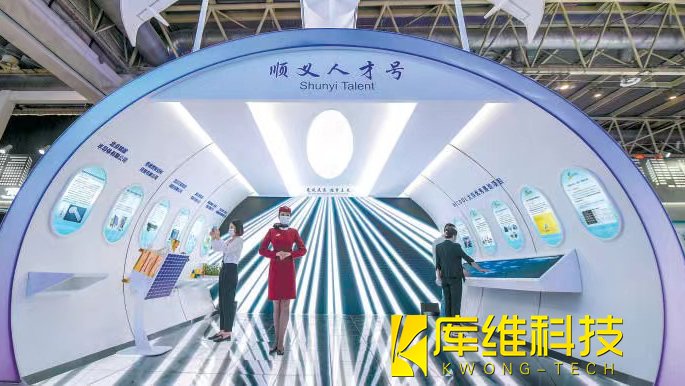 在順義展區(qū),模擬機艙的展臺“順義人才號”也頗為吸引眼球。走進展臺,就像走入機艙,兩側(cè)是優(yōu)秀項目介紹,前方大屏幕上的聲光電影講述著順義高端制造業(yè)的故事,代入感十足。