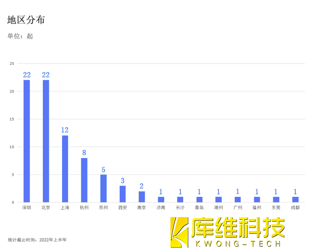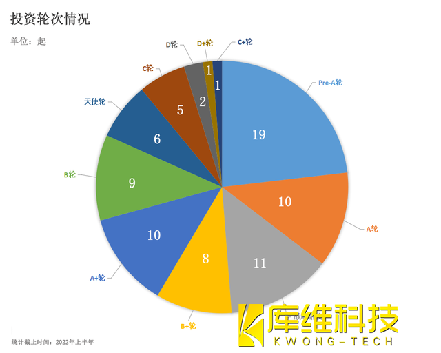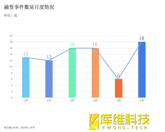 從時(shí)間維度上來(lái)看,2022上半年,融資事件的峰值出現(xiàn)在6月,發(fā)生18起,5月融資數(shù)量最少,僅為6起,平均每月發(fā)生13起融資事件。