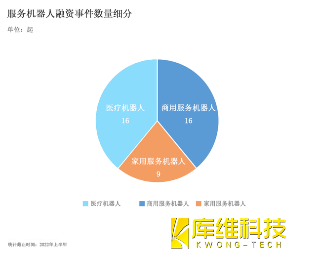 在服務(wù)機(jī)器人領(lǐng)域,根據(jù)獲得融資的企業(yè),共分為醫(yī)療機(jī)器人、商用服務(wù)機(jī)器人和家用服務(wù)機(jī)器人三大類。其中,商用服務(wù)機(jī)器人獲得融資16起,醫(yī)療機(jī)器人在上半年也備受資本關(guān)注,融資數(shù)量同樣為16起,而家用服務(wù)機(jī)器人在上半年相對(duì)遇冷,僅發(fā)生了9起融資事件。