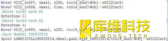 比如說:在機器人走到某一點的時候,有可能和其他機器人發生干涉,那在這個點的前一點或更前面的點,就要提前給出提示,用備注行的形式,寫出會與哪個機器人發生干涉,如上圖的: !enter lock with R1。但是EnterZone2這個就不需要寫了,因為這個是后續和PLC交換信息時候才會用到,前期程序導入,機器人會認不到這個命令而報錯。