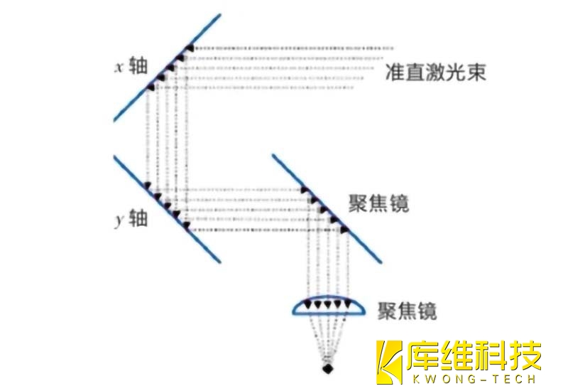 振鏡焊接頭的主要組成部分為擴束準直鏡、聚焦透鏡、XY 兩軸掃描振鏡、控制板卡以及上位機計算機軟件系統(tǒng)。振鏡可以改變激光光束的方向,通過電磁驅動機構帶動擺動或通過步進電機驅動旋轉掃描。通過振鏡的運動,可以實現對光束的快速掃描,控制光斑在焊縫上高速移動,獲得理想的焊縫。光束從QBH進入準直模塊,轉變?yōu)槠叫泄馐俳涍^聚焦模塊進行聚焦,以糾正激光束在聚焦平面上的枕形畸變,保證光束在同一焦平面內的精準移動。目前,實現光束擺動主要通過能夠承受高功率激光的振鏡實現,如圖所示。