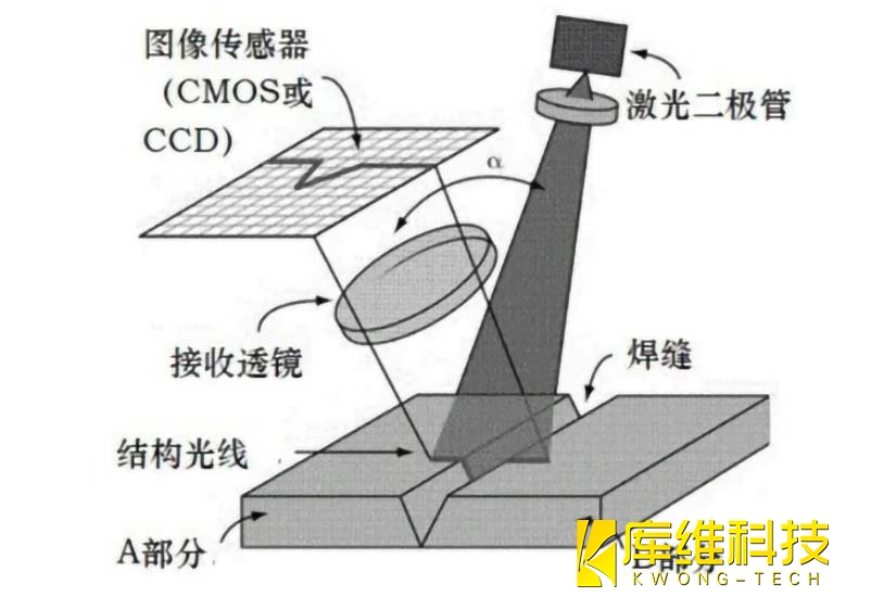 焊縫跟蹤技術通常基于傳感器(如激光傳感器或視覺傳感器)來實時采集焊縫的圖像信息,然后通過圖像處理和分析來識別焊縫的位置和形狀。控制器根據這些信息調整執行機構(如焊接機器人的焊槍),實現對焊縫的精確跟蹤。其中,激光焊縫跟蹤技術利用激光三角形測量法,通過激光器發射線激光照射到工件表面,經過漫反射后,激光輪廓在CCD或CMOS傳感器上成像。控制器對采集到的圖像進行處理分析,獲取焊縫的位置,用于修正焊接軌跡或引導焊接,如圖所示。視覺圖像法主要基于普通視覺的焊縫跟蹤使用光學攝像頭或工業相機對焊縫進行拍攝,獲取焊縫的圖像信息,然后利用圖像處理算法對圖像進行分析和處理,提取出焊縫的位置和形狀信息。