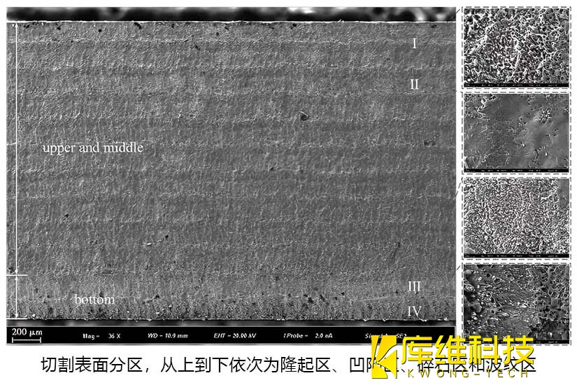 對水導激光切割后的TC4鈦合金表面形貌進行了詳細分析。切割后的表面隆起、凹陷處呈現出不同特征,根據形態特點可分為隆起區、凹陷區、碎石區、波紋區這 4 種區域。隆起區和凹陷區在切割表面的上部、中部交替循環出現,碎石區和波紋區出現在切割表面的底部。