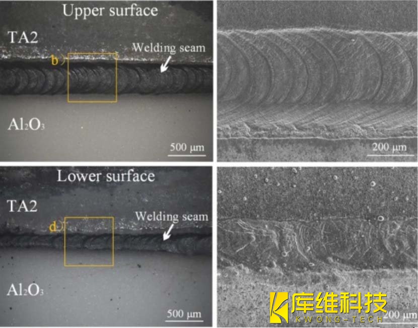 焊接過程中,鈦與氧化鋁在界面處形成??TiO?過渡層??(20-30μm),通過擴散反應實現冶金結合,避免了脆性金屬間化合物(如TiAl)的生成。實驗表明,激光功率19.52W、焊接速度0.8mm/s時,接頭完全熔透且無裂紋,彎曲強度達134.9MPa,接近基材強度的60%。