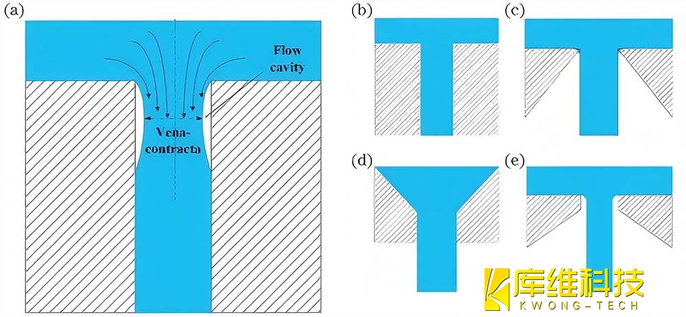 水射流的形成始于耦合腔噴嘴的特殊設(shè)計。如圖1所示,水流從上方流入收縮段(Vena contracti),經(jīng)流腔(Flow cavity)加速后形成直徑約微米級的細(xì)射流。噴嘴形狀(如T形、圓形等)直接影響射流穩(wěn)定性: